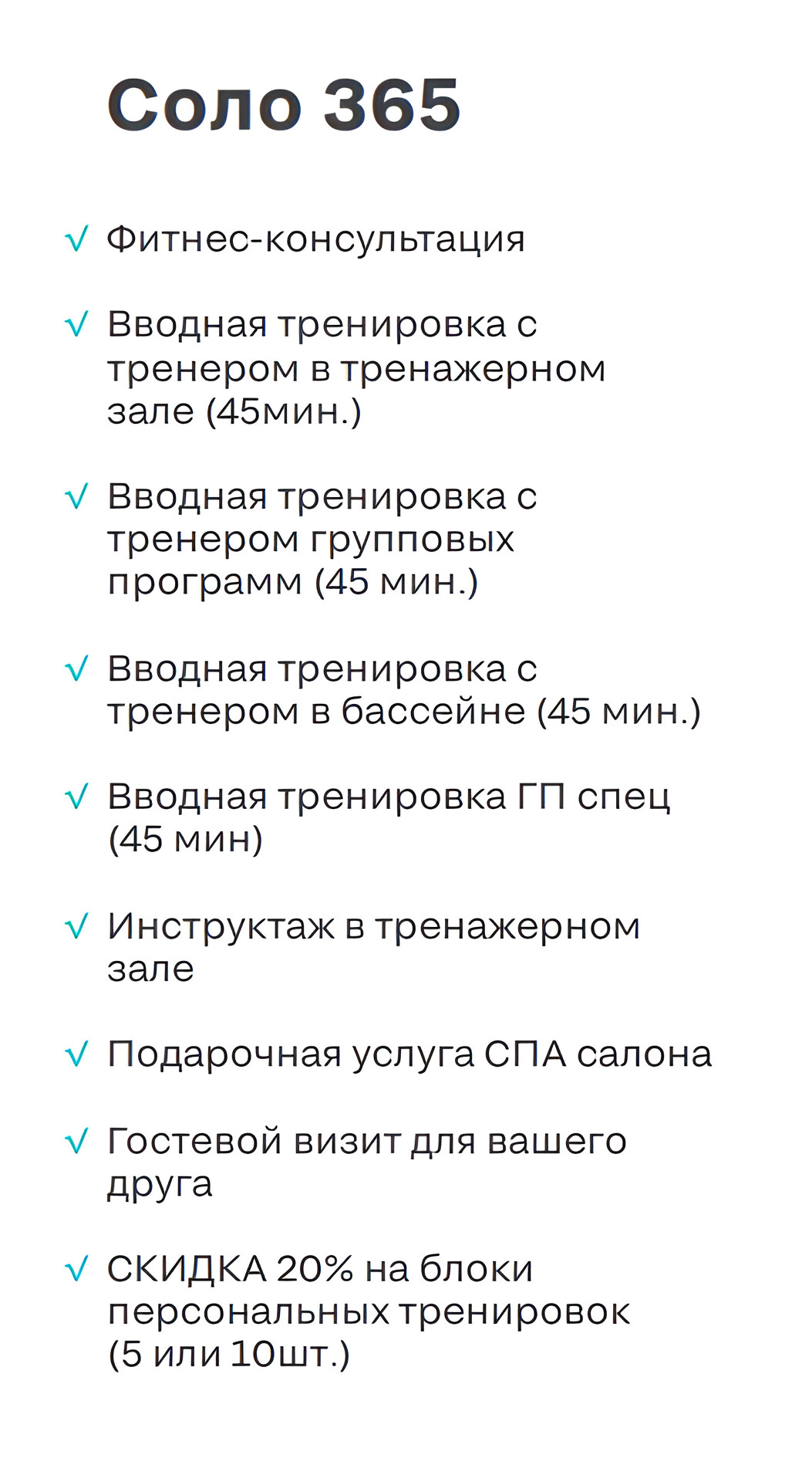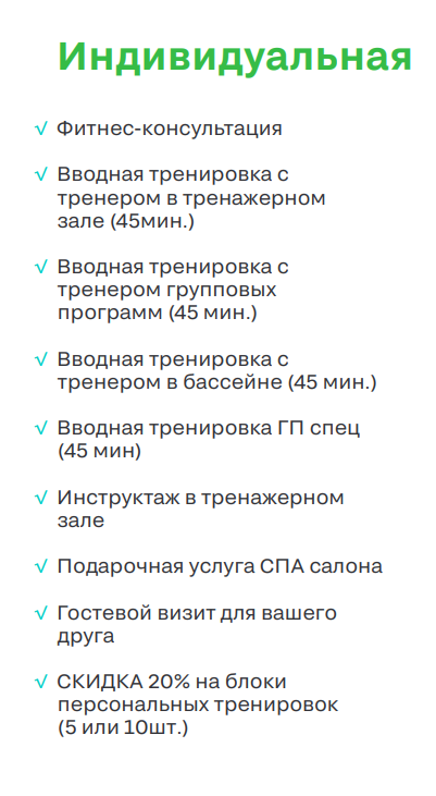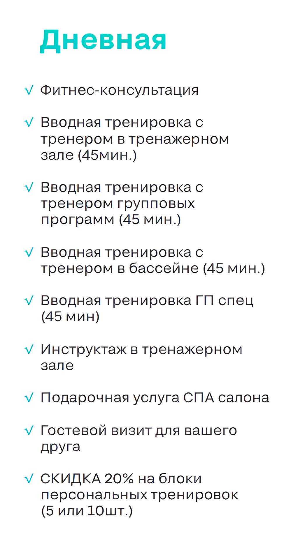 • профессиональное сопровождение в любой из зон (тренажерный зал, студии групповых программ, бассейн, детский фитнес)